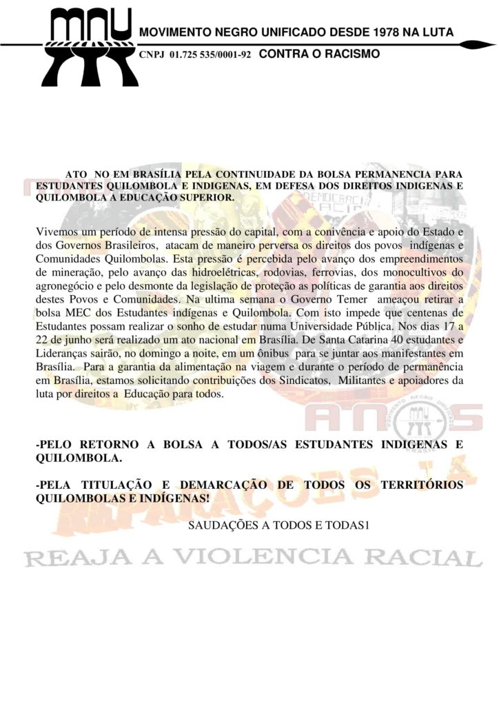 O Núcleo de Estudos de Identidades e Relações Interétnicas (NUER) abre seleção para 01 vaga de Ações Afirmativas, destinada a estudantes de graduação em: museologia, arquivologia, biblioteconomia, ciências sociais e antropologia