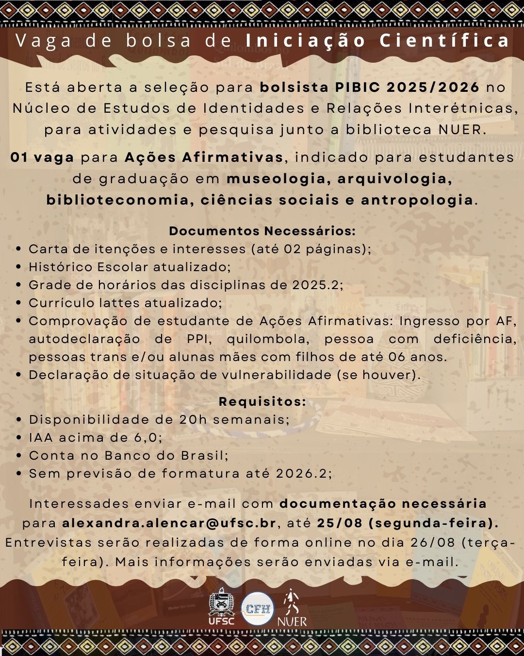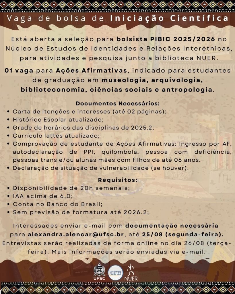O Núcleo de Estudos de Identidades e Relações Interétnicas (NUER) abre seleção para 01 vaga de Ações Afirmativas, destinada a estudantes de graduação em: museologia, arquivologia, biblioteconomia, ciências sociais e antropologia