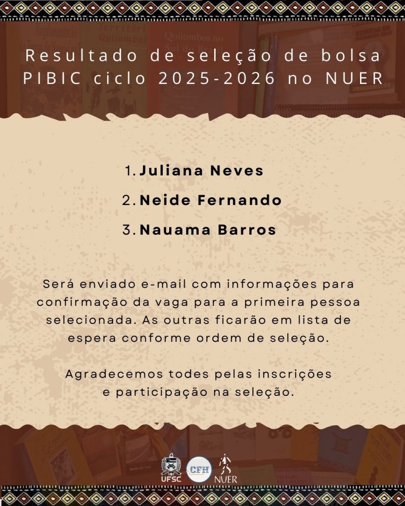 Segue a publicação dos selecionades para a vaga de PIBIC – Programa Institucional de Bolsas de Iniciação Científica da UFSC (na modalidade de Ações Afirmativas) para o ciclo 2025-2026 .